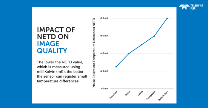 NETD değeri <25 mK olan bir termal kamera, görüş alanındaki çok küçük sıcaklık farklarını, NETD değeri <60 mK olan bir kameraya kıyasla ayırt edebilir. Her iki kamera da 640 × 480 çözünürlüğe sahip olsa bile, yani görüntü oluşturmak için 307.200 piksel kullanıyor olsa da, <25 mK NETD değerine sahip kamera, <60 mK olan kameraya kıyasla çok daha net bir görüntü üretecektir.